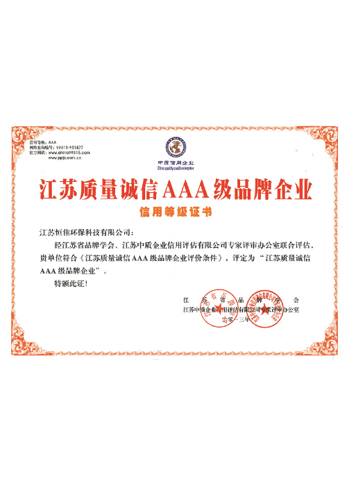 經過多年來的不懈努力,公司已經形成良好的管理和運作體系。獲得了<江蘇質量誠信3a品牌企業>榮譽證書 并已通過ISO9001質理管理體系認證、ISO1400環境管理體系標準及 ISO45001職業健康管理體系標準。